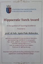 Absolwenci wyrazili wdzięczność całej kadrze dydaktycznej za wsparcie i zaangażowanie w trakcie całego procesu kształcenia. Szczególne podziękowania skierowali do najlepszych wykładowców, którym wręczyli pamiątkowe dyplomy. W gronie wyróżnionych jest Kierownik Katedry Fizjologii UJ CM prof. dr hab. med. Agata Ptak-Belowska.